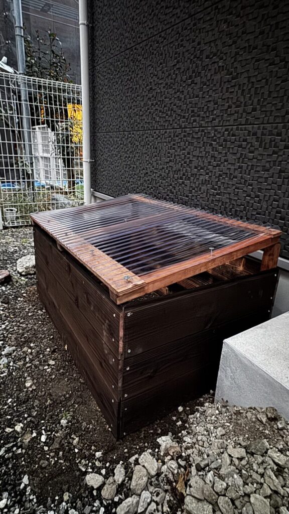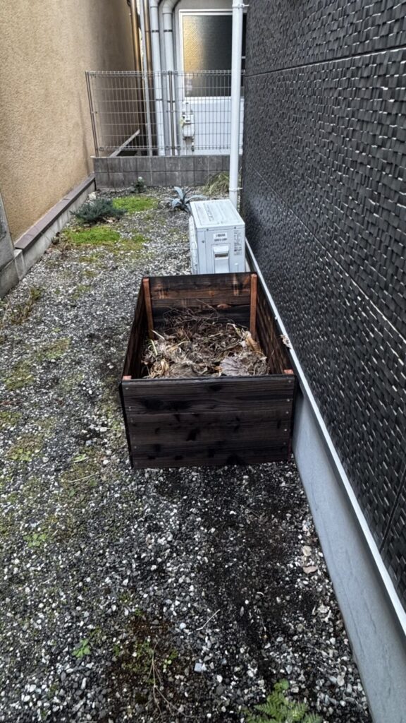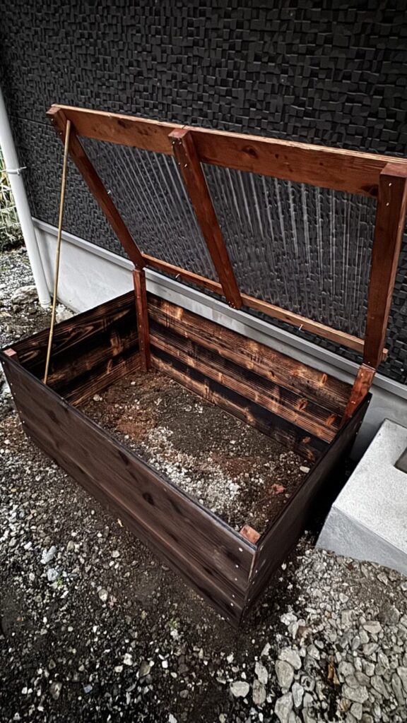 一度に2つも作ったのには訳があって、それは買った材料を使い切るためです。木はすぐにボロボロになってしまうと思われるので、ある程度耐久性を持たせないとコスパもタイパも悪くなります。それで色々検討して、腐食にある程度強いとされている焼杉材を使いました。その焼杉材が長さ2m×12枚セットで売られていたので、それを全部有効活用したわけです。角材に焼杉材を打ち付け、底のない箱を作るだけなので簡単でした。ちなみに角材には柿渋を何度も重ね塗りして防腐効果を持たせました。