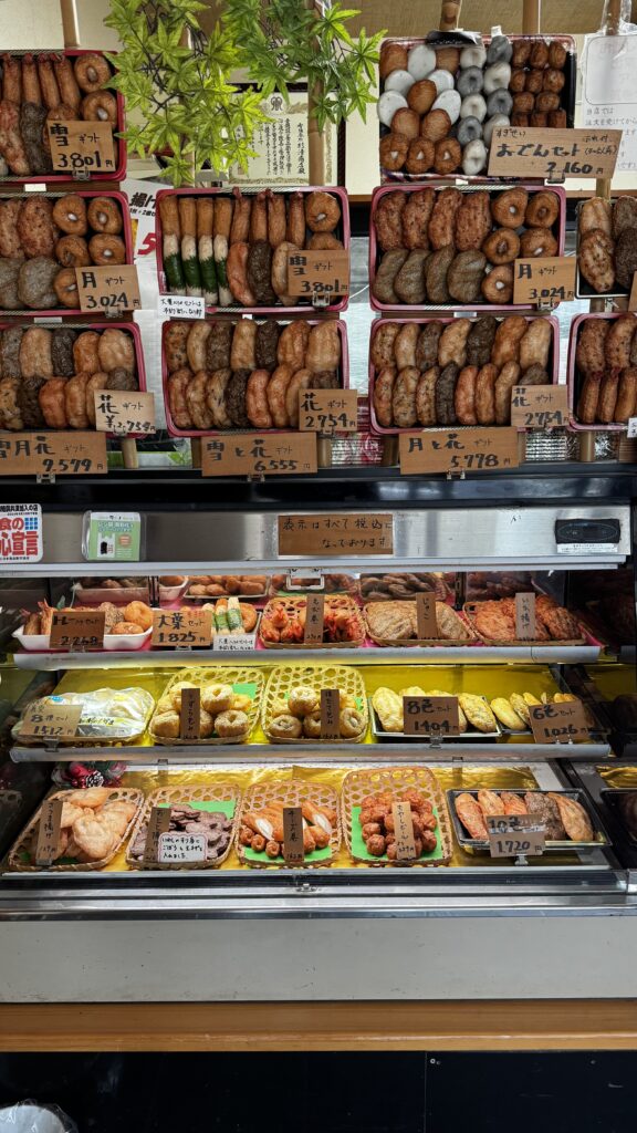 別の日に、改めてこちらのかまぼこ通りを訪れました。杉清商店(すぎせいしょうてん)にて、さつま揚げを買ったら、目の前で揚げてくれました。その場で食べられるようにベンチも用意されていました。