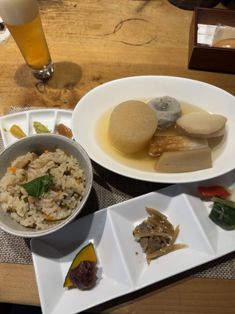 注文すると、店員さんが目の前でおでん鍋から取り分けて出してくれました。ランチビールも付けていただきました。おいしかったです。