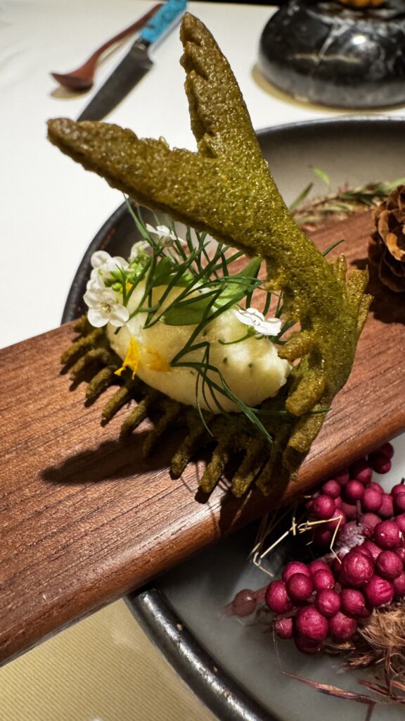 4.ブランダードの下、魚の骨の形をしたチュイルは春菊入り。