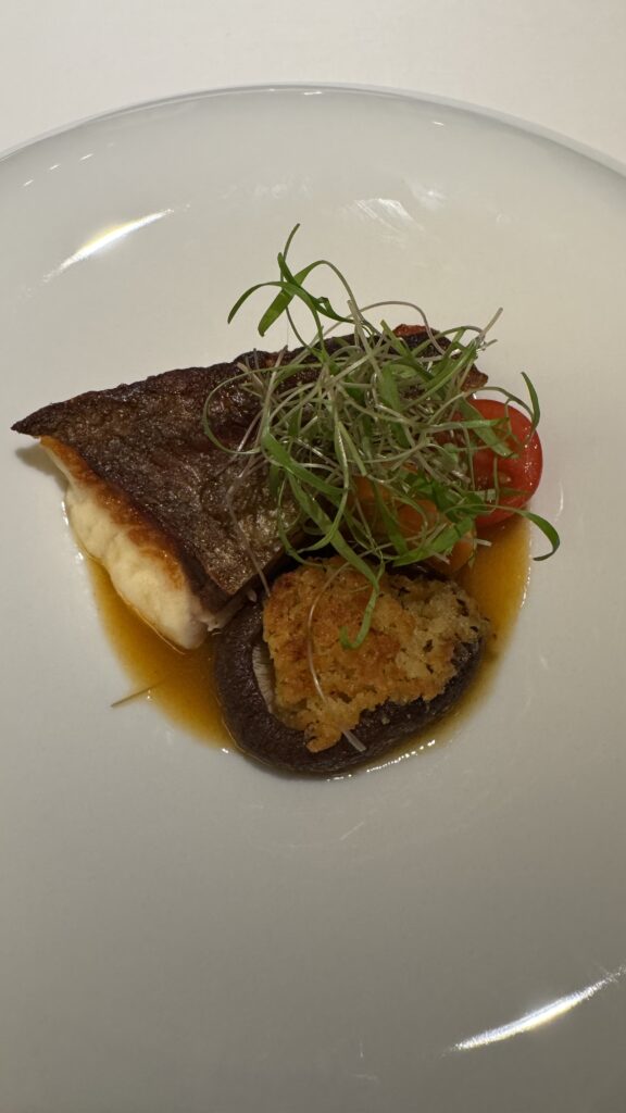 7.真鯛のポワレ、ブイヤベース、椎茸のにんにくパン粉焼き。