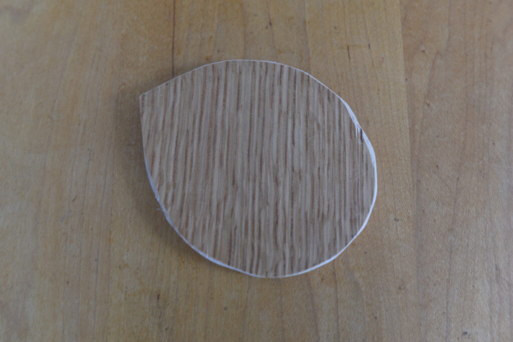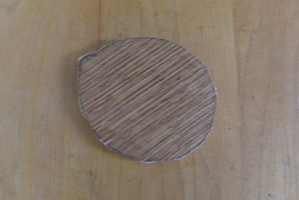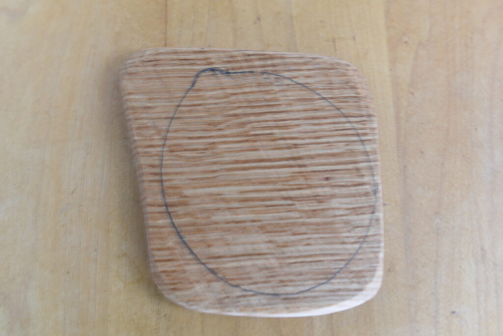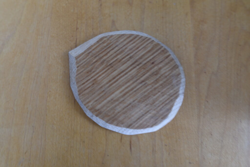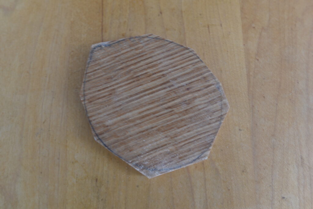 以下、プロセスです。まず、壺から木切れに形を写し取りました。次に、胴付鋸で余分を切り落としました。その後、鑿(のみ)と玄能(げんのう)で細かい部分を掻き落としました。裏側の壺と接する部分は、鑿で縁を斜めに削り、蓋が壺にはまるようにしました。サンドペーパーで削って完成しました。